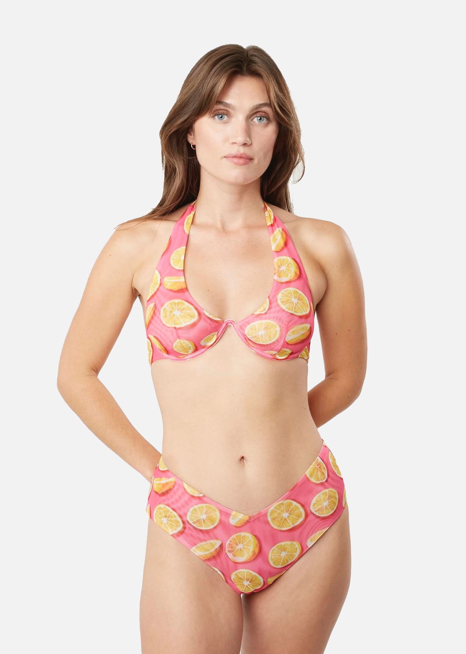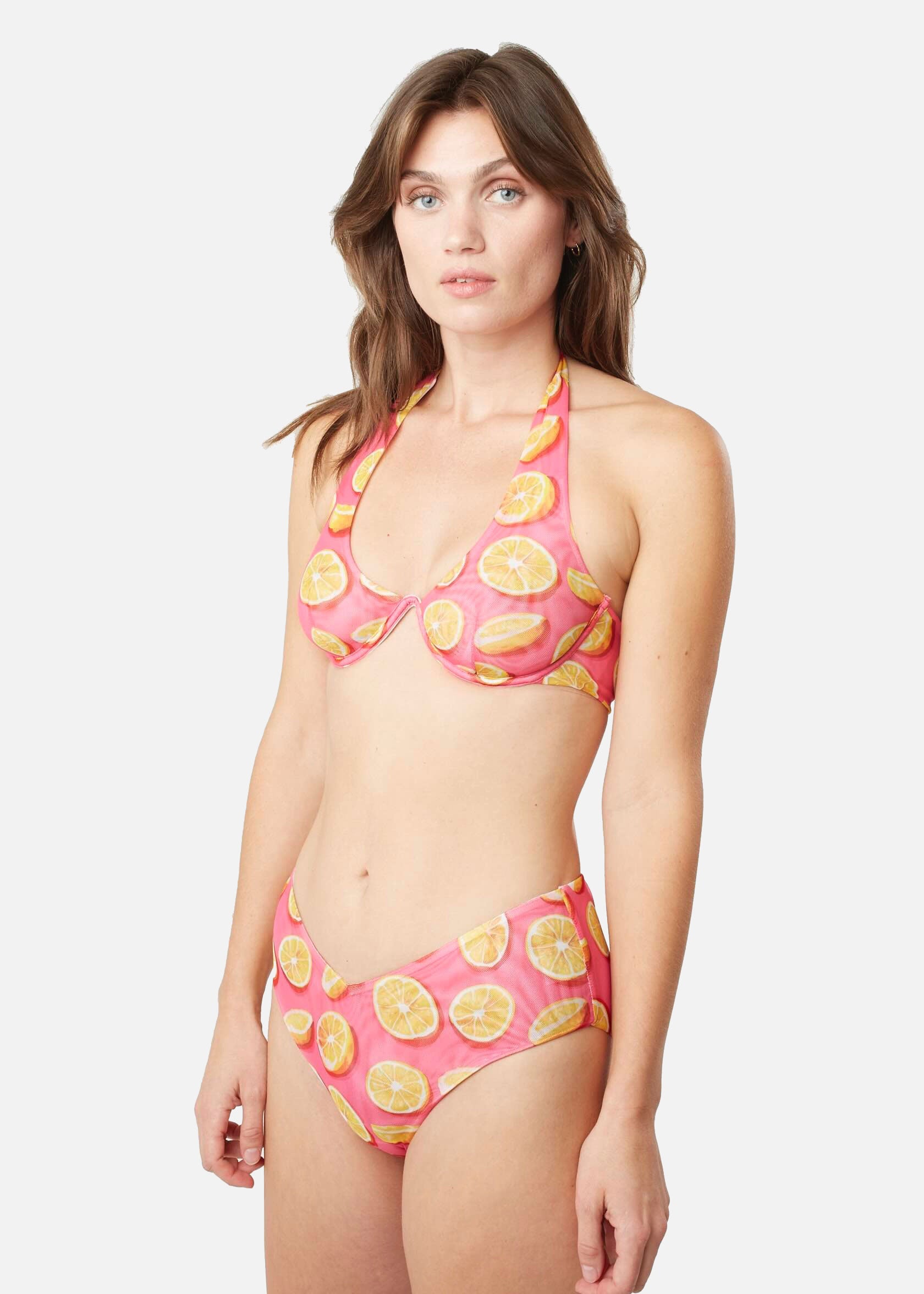 Denna snygga bikinitrosa i rosa med gula citroner kombinerar stil och komfort på ett perfekt sätt. Trosan har en modern V-formad skärning som framhäver midjan och skapar en smickrande siluett. Baksidan erbjuder täckning utan att kompromissa med designen. Med sin bekväma passform och mjuka, följsamma material är den idealisk för både soliga stranddagar och svalkande dopp i havet.
