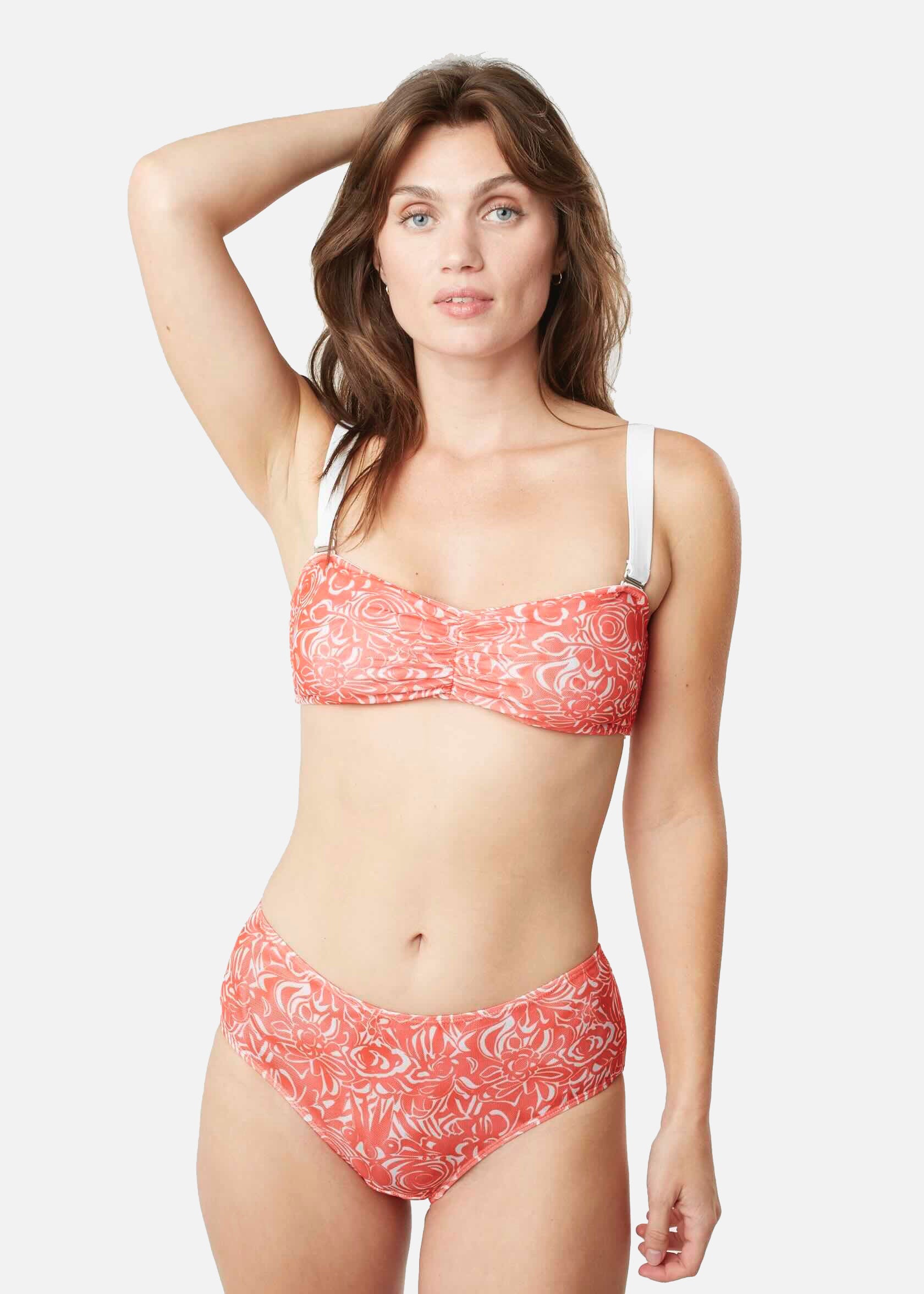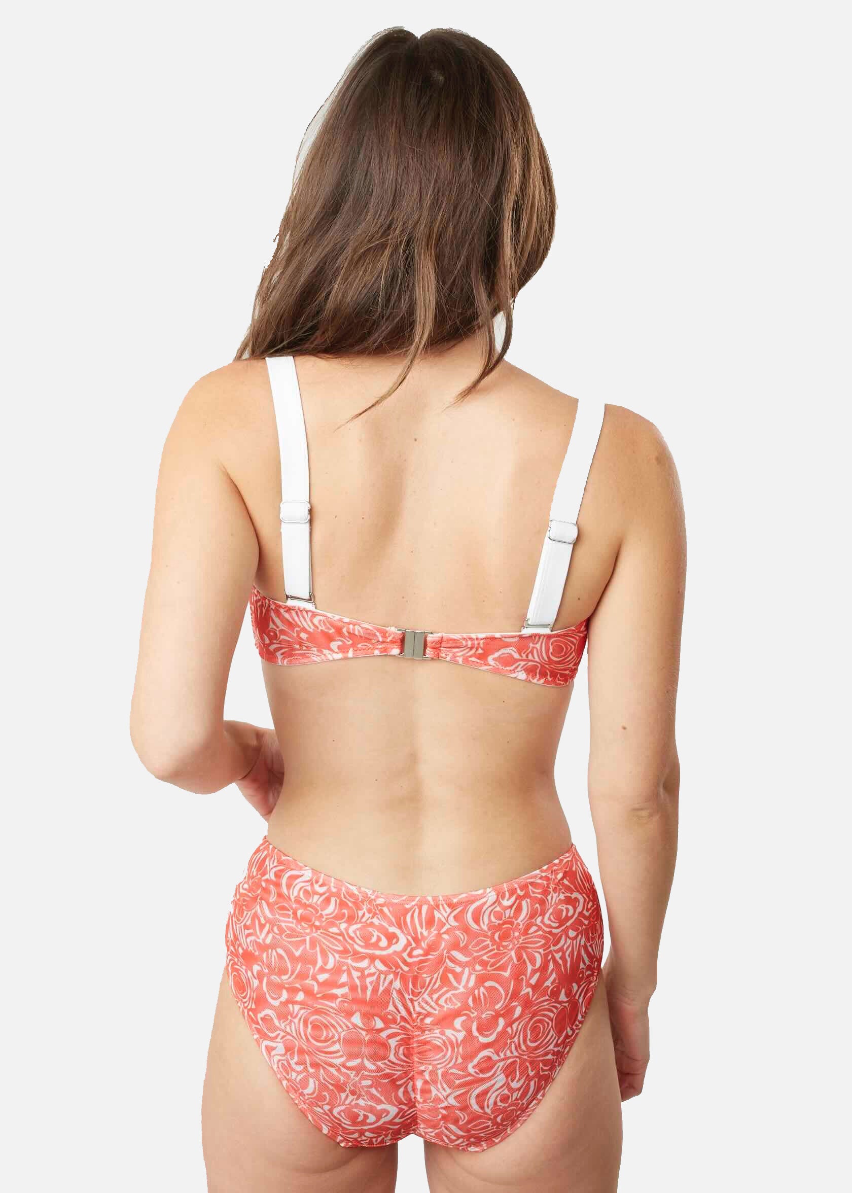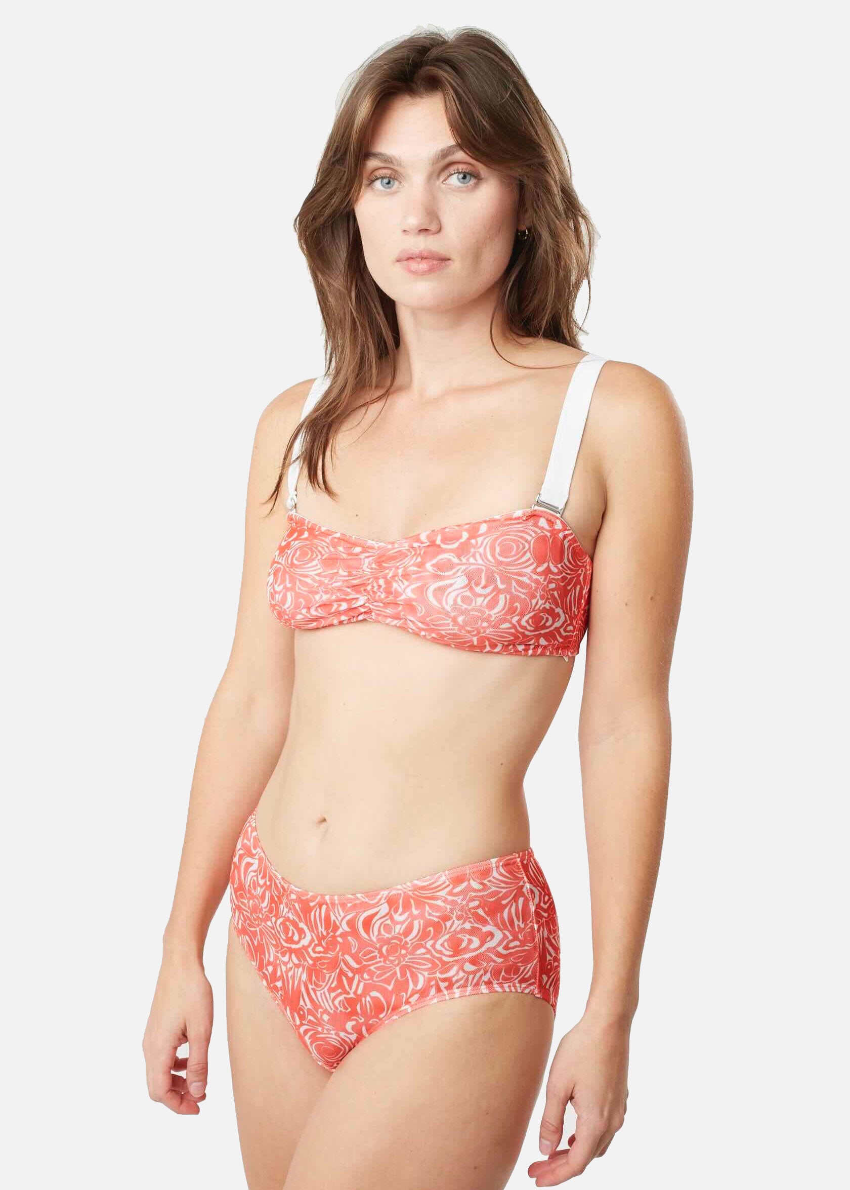 Bikinitopp i rött mönster. Toppen har skenor på sidan som ger ett bra stöd för bysten och knäpps med ett metallspänne bak i ryggen. Axelbanden är avtagbara och du kan enkelt justera längden på dessa. Det finns två öglor att välja mellan för axelbanden på varje sida för bättre anpassning och passform. Toppen har silikonremsor både upptill och nertill för att hålla toppen på plats även utan axelbanden. Uttagbara inlägg medföljer som är något tjockare för att ge lite extra push. Toppen har tre lager tyg vid bysten, som motsvarar ungefär solskyddsfaktor 30, och enkeltyg baktill.
