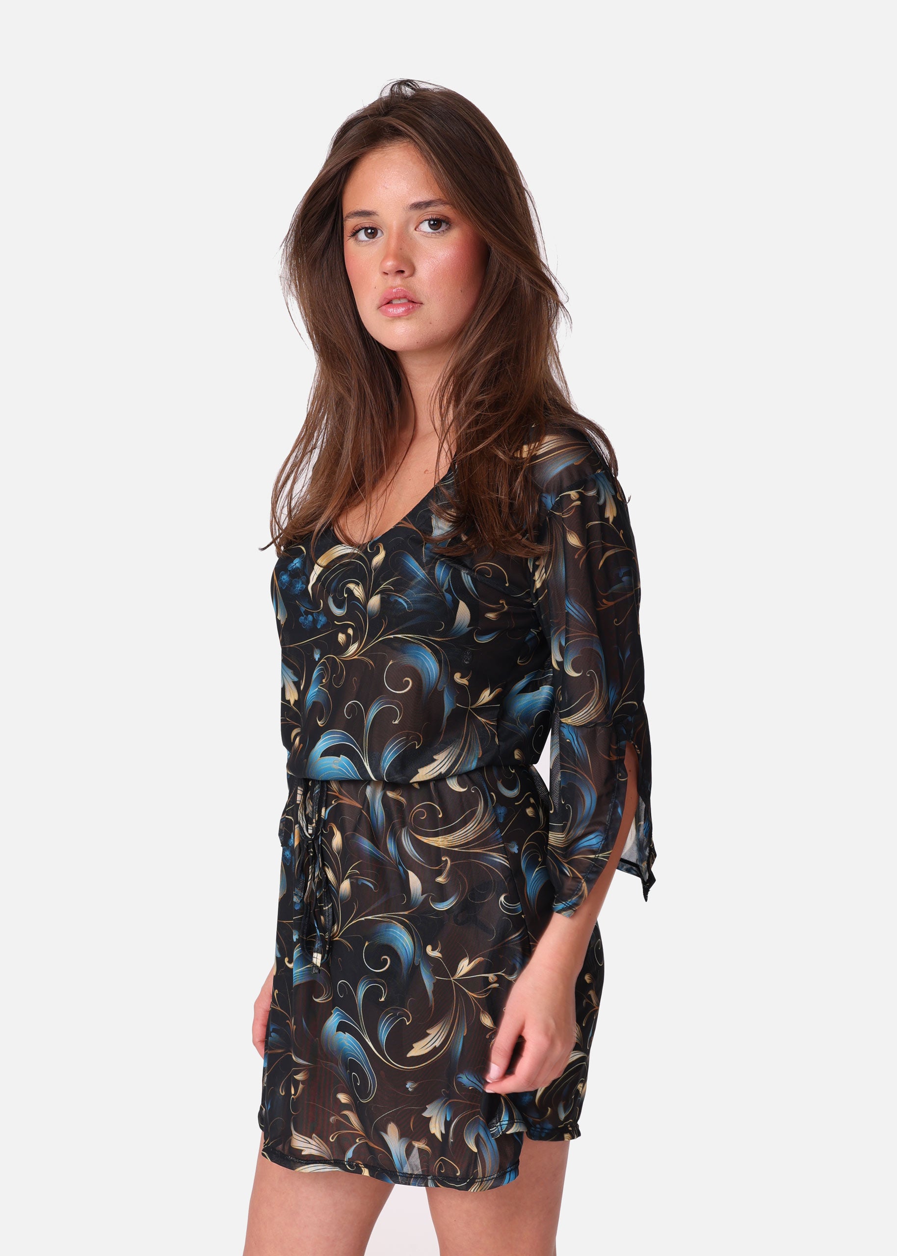 V-ringad tunika i ett elegant mönster med färgerna svart, blått och guld som har vida ärmslut. Till tunikan medföljer ett knytband som kan knytas under bysten eller vid midjan om så önskas. Perfekt strandplagg att dra på sig över bikinin.