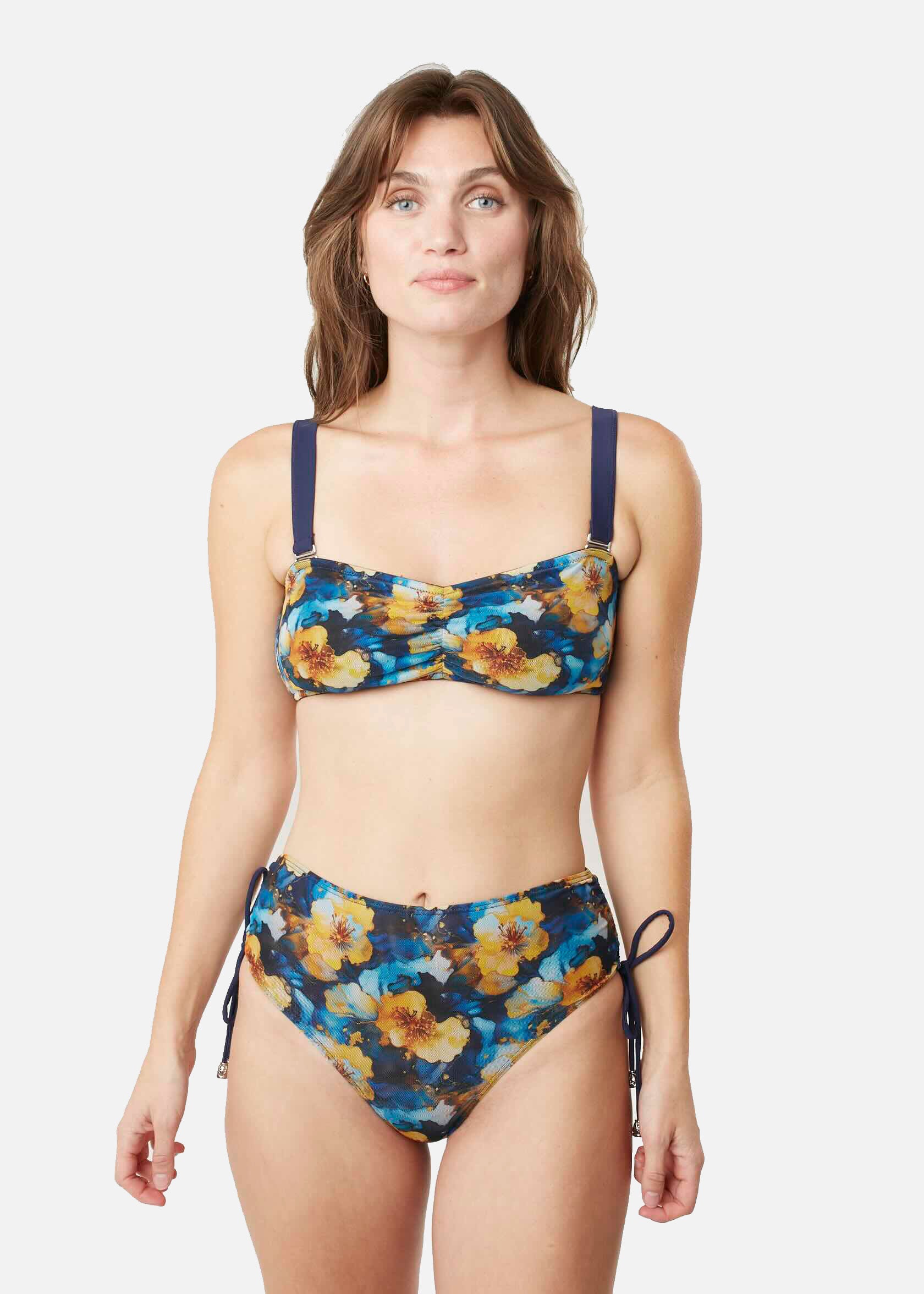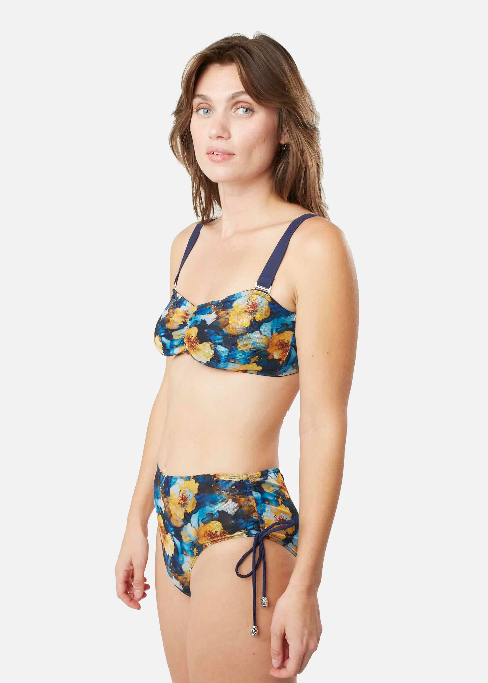 Bikinitrosa i blommigt mönster i färgerna blått och gult med hög midja som är bredare i sidorna. Med hjälp av snörena på sidorna kan du själv bestämma hur högt skuren du vill att trosan ska vara. Trosan är sydd med scrunch butt, vilket innebär att tyget är rynkat baktill utan att för den sakens skull skära in. Scrunchen framhäver dina former på ett bra och attraktivt sätt.