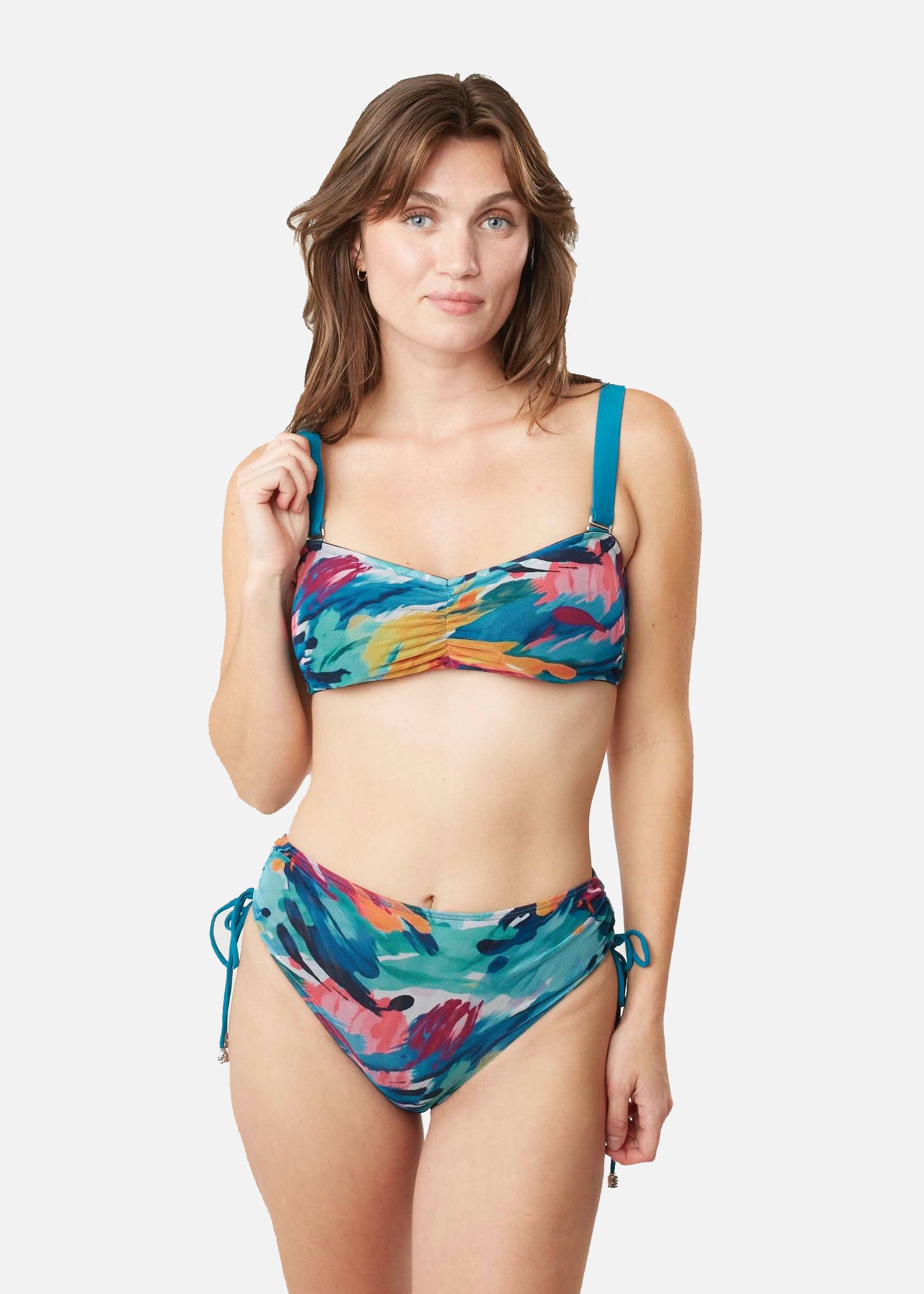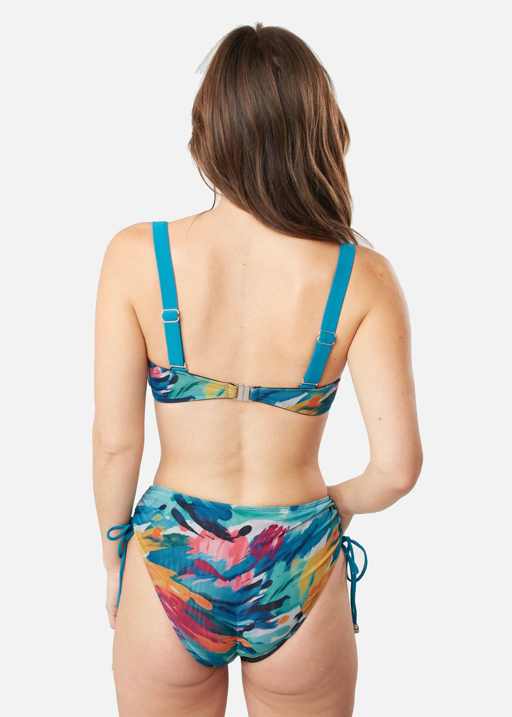 En färgglad turkosmönstrad bikinitopp med skenor på sidan som ger ett bra stöd för bysten och knäpps med ett metallspänne bak i ryggen. Axelbanden är avtagbara och du kan enkelt justera längden på dessa. Det finns två öglor att välja mellan för axelbanden på varje sida för bättre anpassning och passform. Toppen har silikonremsor både upptill och nertill för att hålla toppen på plats även utan axelbanden. Uttagbara inlägg medföljer som är något tjockare för att ge lite extra push. Toppen har tre lager tyg vid bysten, som motsvarar ungefär solskyddsfaktor 30, och enkeltyg baktill.
