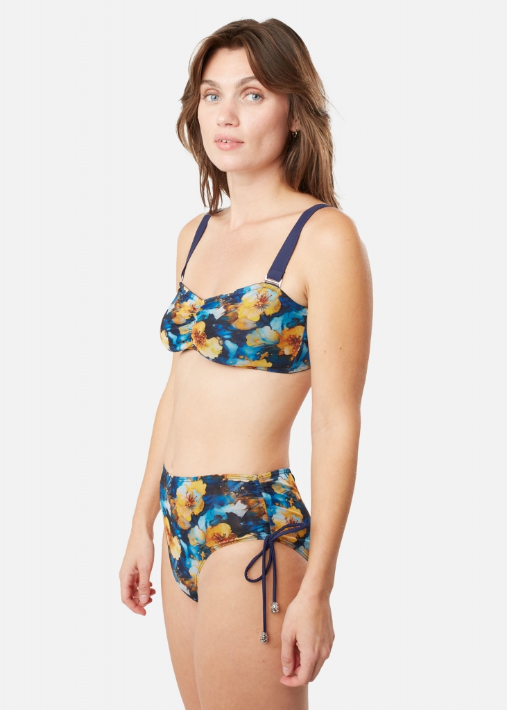 Bikintruser i blomstermønster i fargene blått og gult med høyt liv som er bredere i sidene. Ved hjelp av lissene på sidene kan du bestemme hvor høyt snitt du vil at trusen skal ha. Trusen er sydd med en scrunch butt, som gjør at stoffet er rynket bak uten å skjære inn. Scrunchen fremhever kurvene dine på en god og attraktiv måte.